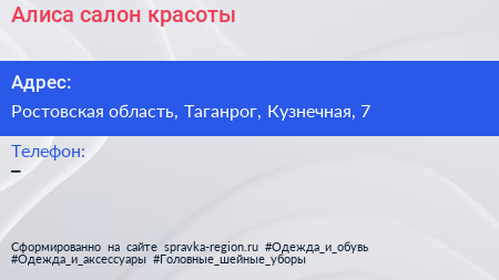 Алиса, салон красоты по адресу Ростовская область, Таганрог, Кузнечная, 7 в дальнейшем Организация, размещена в следующих категориях: