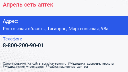 Апрель, сеть аптек по адресу Ростовская область, Таганрог, Мартеновская, 98а в дальнейшем Организация, размещена в следующих категориях: