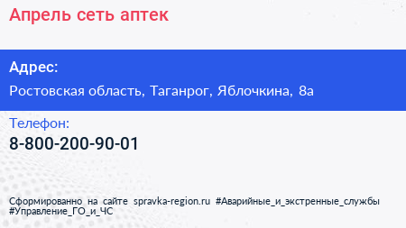Апрель, сеть аптек по адресу Ростовская область, Таганрог, Яблочкина, 8а в дальнейшем Организация, размещена в следующих категориях: