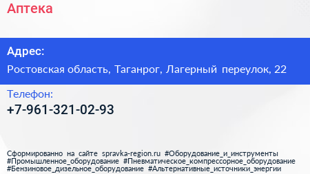 Аптека по адресу Ростовская область, Таганрог, Лагерный переулок, 22 в дальнейшем Организация, размещена в следующих категориях: