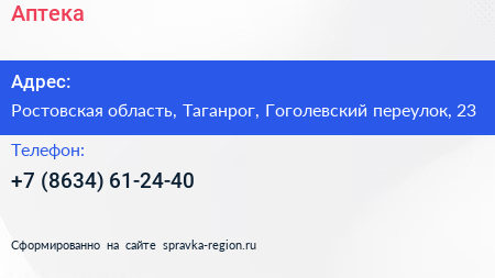 Аптека по адресу Ростовская область, Таганрог, Гоголевский переулок, 23 в дальнейшем Организация, размещена в следующих категориях: