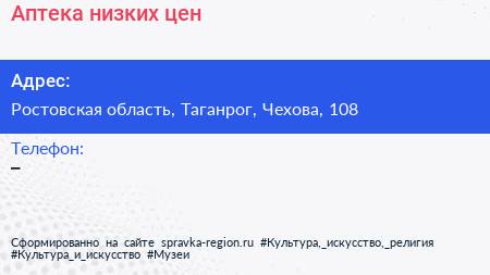 Аптека низких цен по адресу Ростовская область, Таганрог, Чехова, 108 в дальнейшем Организация, размещена в следующих категориях: