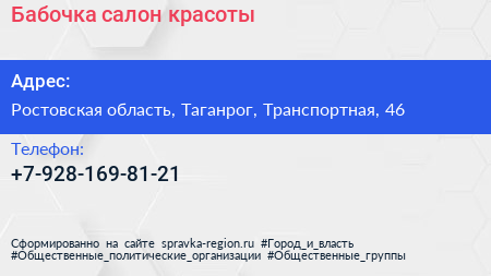 Бабочка, салон красоты по адресу Ростовская область, Таганрог, Транспортная, 46 в дальнейшем Организация, размещена в следующих категориях: