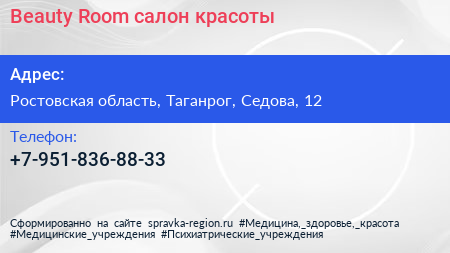 Beauty Room, салон красоты по адресу Ростовская область, Таганрог, Седова, 12 в дальнейшем Организация, размещена в следующих категориях: