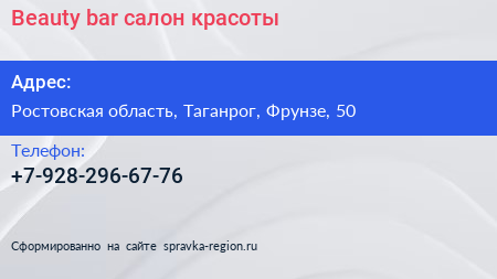 Beauty bar, салон красоты по адресу Ростовская область, Таганрог, Фрунзе, 50 в дальнейшем Организация, размещена в следующих категориях: