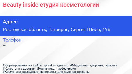 Beauty inside, студия косметологии по адресу Ростовская область, Таганрог, Сергея Шило, 196 в дальнейшем Организация, размещена в следующих категориях: