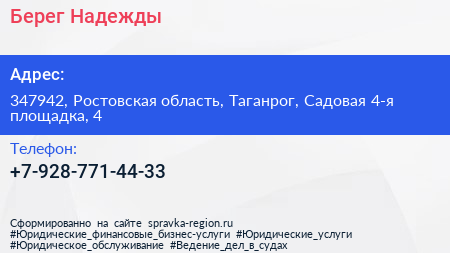 Берег Надежды по адресу 347942, Ростовская область, Таганрог, Садовая 4-я площадка, 4 в дальнейшем Организация, размещена в следующих категориях: