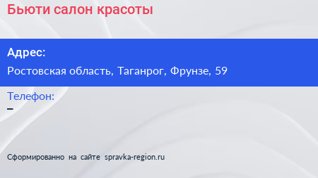 Бьюти, салон красоты по адресу Ростовская область, Таганрог, Фрунзе, 59 в дальнейшем Организация, размещена в следующих категориях: