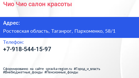 Чио Чио, салон красоты по адресу Ростовская область, Таганрог, Пархоменко, 58/1 в дальнейшем Организация, размещена в следующих категориях: