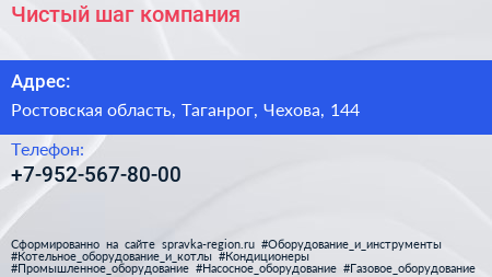 Чистый шаг, компания по адресу Ростовская область, Таганрог, Чехова, 144 в дальнейшем Организация, размещена в следующих категориях: