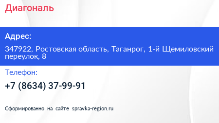 Диагональ по адресу 347922, Ростовская область, Таганрог, 1-й Щемиловский переулок, 8 в дальнейшем Организация, размещена в следующих категориях: