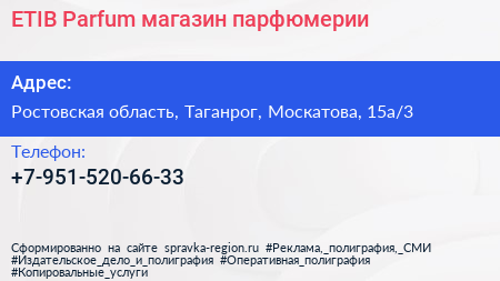 ETIB Parfum, магазин парфюмерии по адресу Ростовская область, Таганрог, Москатова, 15а/3 в дальнейшем Организация, размещена в следующих категориях: