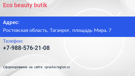 Eco beauty butik по адресу Ростовская область, Таганрог, площадь Мира, 7 в дальнейшем Организация, размещена в следующих категориях: