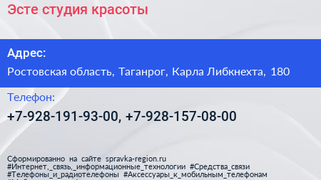 Эсте, студия красоты по адресу Ростовская область, Таганрог, Карла Либкнехта, 180 в дальнейшем Организация, размещена в следующих категориях:
