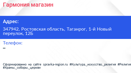 Гармония, магазин по адресу 347942, Ростовская область, Таганрог, 1-й Новый переулок, 12Б в дальнейшем Организация, размещена в следующих категориях: