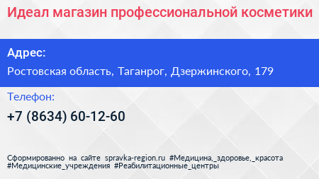 Идеал, магазин профессиональной косметики по адресу Ростовская область, Таганрог, Дзержинского, 179 в дальнейшем Организация, размещена в следующих категориях: