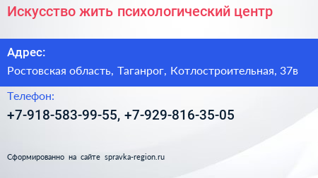 Искусство жить, психологический центр по адресу Ростовская область, Таганрог, Котлостроительная, 37в в дальнейшем Организация, размещена в следующих категориях: