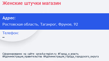 Женские штучки, магазин по адресу Ростовская область, Таганрог, Фрунзе, 92 в дальнейшем Организация, размещена в следующих категориях:
