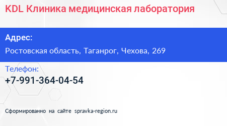 KDL-Клиника, медицинская лаборатория по адресу Ростовская область, Таганрог, Чехова, 269 в дальнейшем Организация, размещена в следующих категориях: