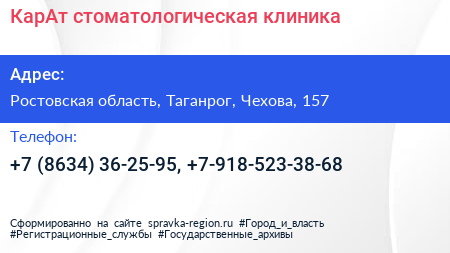 КарАт, стоматологическая клиника по адресу Ростовская область, Таганрог, Чехова, 157 в дальнейшем Организация, размещена в следующих категориях: