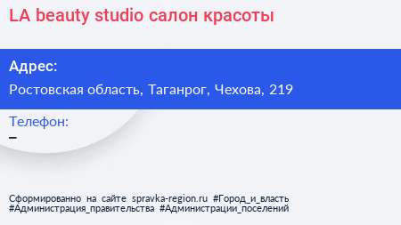 LA beauty studio, салон красоты по адресу Ростовская область, Таганрог, Чехова, 219 в дальнейшем Организация, размещена в следующих категориях: