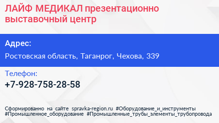 ЛАЙФ МЕДИКАЛ, презентационно-выставочный центр по адресу Ростовская область, Таганрог, Чехова, 339 в дальнейшем Организация, размещена в следующих категориях: