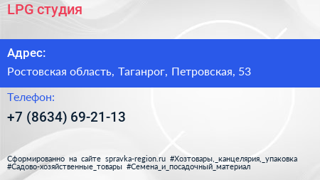 LPG, студия по адресу Ростовская область, Таганрог, Петровская, 53 в дальнейшем Организация, размещена в следующих категориях: