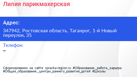 Лилия, парикмахерская по адресу 347942, Ростовская область, Таганрог, 1-й Новый переулок, 35 в дальнейшем Организация, размещена в следующих категориях: