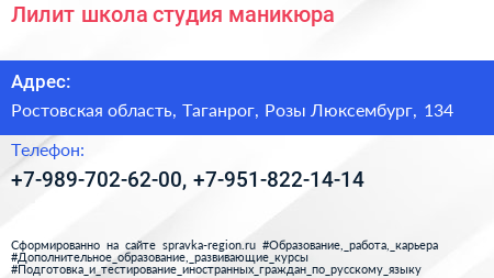 Лилит, школа-студия маникюра по адресу Ростовская область, Таганрог, Розы Люксембург, 134 в дальнейшем Организация, размещена в следующих категориях: