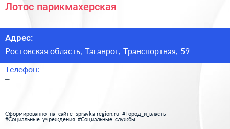 Лотос, парикмахерская по адресу Ростовская область, Таганрог, Транспортная, 59 в дальнейшем Организация, размещена в следующих категориях: