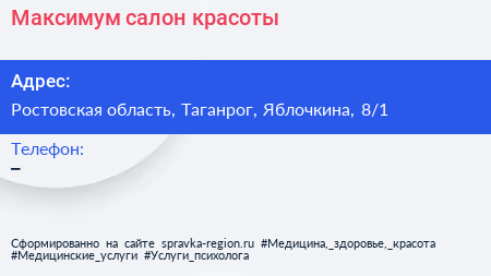 Максимум, салон красоты по адресу Ростовская область, Таганрог, Яблочкина, 8/1 в дальнейшем Организация, размещена в следующих категориях: