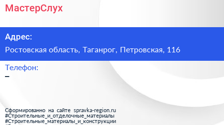 МастерСлух по адресу Ростовская область, Таганрог, Петровская, 116 в дальнейшем Организация, размещена в следующих категориях: