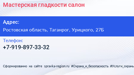 Мастерская гладкости, салон по адресу Ростовская область, Таганрог, Урицкого, 27Б в дальнейшем Организация, размещена в следующих категориях: