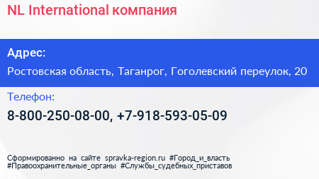 NL International, компания по адресу Ростовская область, Таганрог, Гоголевский переулок, 20 в дальнейшем Организация, размещена в следующих категориях: