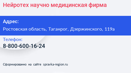 Нейротех, научно-медицинская фирма по адресу Ростовская область, Таганрог, Дзержинского, 119а в дальнейшем Организация, размещена в следующих категориях: