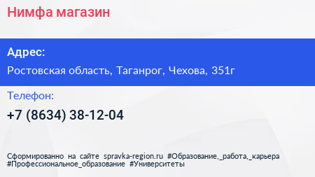 Нимфа, магазин по адресу Ростовская область, Таганрог, Чехова, 351г в дальнейшем Организация, размещена в следующих категориях: