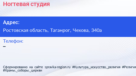 Ногтевая студия по адресу Ростовская область, Таганрог, Чехова, 340а в дальнейшем Организация, размещена в следующих категориях: