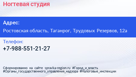 Ногтевая студия по адресу Ростовская область, Таганрог, Трудовых Резервов, 12а в дальнейшем Организация, размещена в следующих категориях: