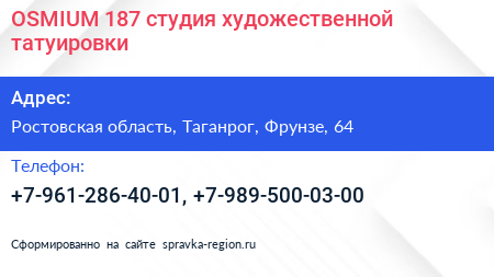 OSMIUM 187, студия художественной татуировки по адресу Ростовская область, Таганрог, Фрунзе, 64 в дальнейшем Организация, размещена в следующих категориях: