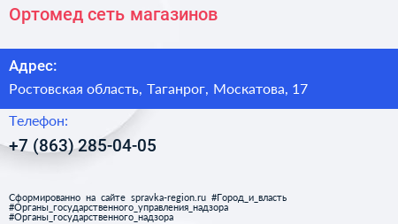 Ортомед, сеть магазинов по адресу Ростовская область, Таганрог, Москатова, 17 в дальнейшем Организация, размещена в следующих категориях: