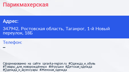 Парикмахерская по адресу 347942, Ростовская область, Таганрог, 1-й Новый переулок, 18Б в дальнейшем Организация, размещена в следующих категориях: