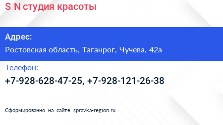 S & N, студия красоты по адресу Ростовская область, Таганрог, Чучева, 42а в дальнейшем Организация, размещена в следующих категориях: