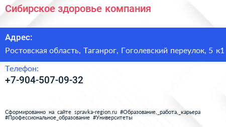 Сибирское здоровье, компания по адресу Ростовская область, Таганрог, Гоголевский переулок, 5 к1 в дальнейшем Организация, размещена в следующих категориях: