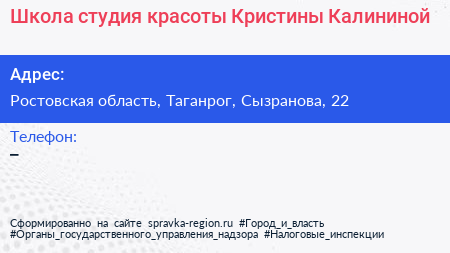 Школа-студия красоты Кристины Калининой по адресу Ростовская область, Таганрог, Сызранова, 22 в дальнейшем Организация, размещена в следующих категориях: