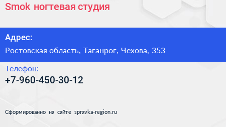 Smok, ногтевая студия по адресу Ростовская область, Таганрог, Чехова, 353 в дальнейшем Организация, размещена в следующих категориях: