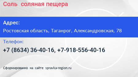 Соль+, соляная пещера по адресу Ростовская область, Таганрог, Александровская, 78 в дальнейшем Организация, размещена в следующих категориях: