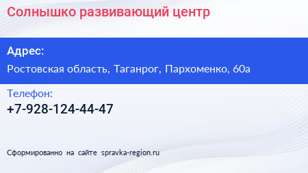 Солнышко, развивающий центр по адресу Ростовская область, Таганрог, Пархоменко, 60а в дальнейшем Организация, размещена в следующих категориях: