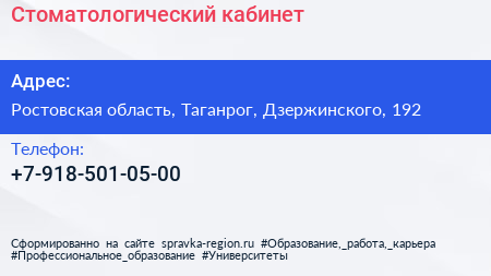 Стоматологический кабинет по адресу Ростовская область, Таганрог, Дзержинского, 192 в дальнейшем Организация, размещена в следующих категориях: