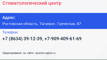 Стоматологический центр по адресу Ростовская область, Таганрог, Греческая, 87 в дальнейшем Организация, размещена в следующих категориях: