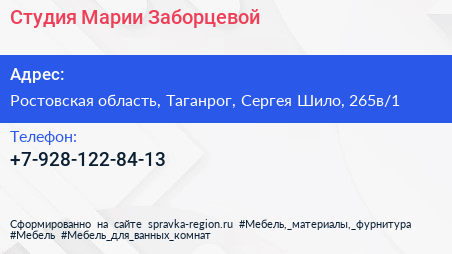 Студия Марии Заборцевой по адресу Ростовская область, Таганрог, Сергея Шило, 265в/1 в дальнейшем Организация, размещена в следующих категориях: